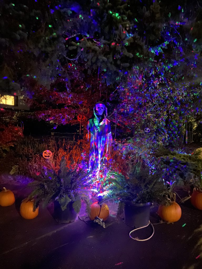 It’s a short walk but it’s filled with danger. Dead bodies, walking dead, ghosts, bats, spiders, skulls, flashing lights, surrounded by the eerie sounds of Halloween. The darkened driveway and yard add to the danger for all trick and treaters who should chance to try for a treat. The trees along the street are filled with sparkling lights glinting off the needles of fir trees and shrubs giving an ethereal, dangerous feeling as in the first photo. Finally, beware of the skeleton at the top of the steps